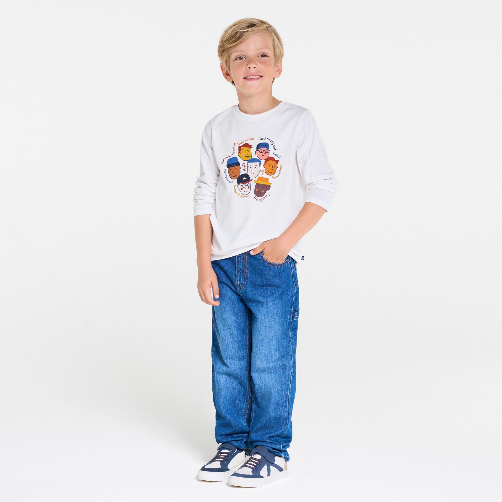 Ce t-shirt blanc pour enfant est parfait pour le quotidien avec son style décontracté et sa coupe regular. Confectionné en jersey doux, il arbore un motif coloré de visages saluant en plusieurs langues. Doté de manches longues et d’un col rond, il assure confort et convivialité. Enfilage facile pour un port sans contraintes. Idéal pour afficher un esprit international et convivial.